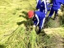 最初は鎌の使い方に戸惑い「なかなか切れない!」「結構力が必要で大変だな。」と苦戦する声が聞こえました。しかし,何度か挑戦するうちにコツをつかみスムーズに稲を刈ることができるようになりました。
